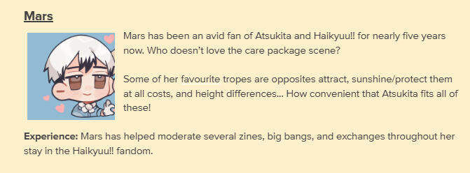 The Atsukita Mini Bang is an event dedicated to the Haikyuu!! pairing consisting of Atsumu Miya and Kita Shinsuke. Come help us spread the Atsukita love by signing up today!